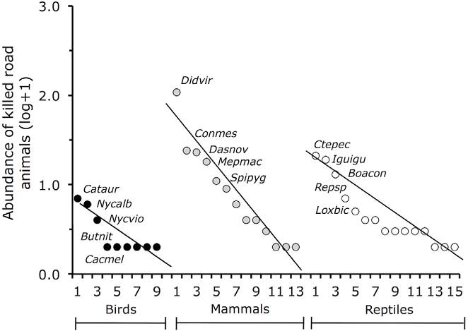 To analyze the relative contribution by different species of killed individuals within each vertebrate group, we constructed rank-abundance graphs (Mueller-Dombois & Ellenberg, 1974). We applied analysis of covariance to compare slopes of fitted logarithmic regression models, among species, as a way to contrast species evenness (Izsák, 2006).