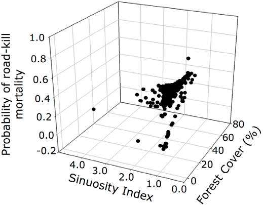 The probability of an animal being killed on the road was similar for all the animal groups (Fig. 5, Table 2). However, we detected a significant negative relationship between road sinuosity and road kill probability. Moreover, we found a significant interaction between percentage of forest canopy cover and road sinuosity (Table 3). Therefore, our model indicated that the highest probability of a road kill was in sections of the road which combined a low sinuosity and greater forest coverage. In contrast, the frequency of animal road kills was lower in the sections of the road having a reduced forest cover and high sinuosity (Fig. 5).