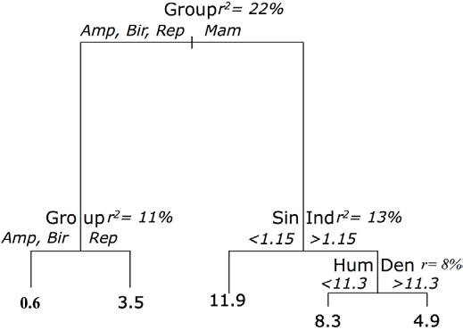 We used classification and regression trees (CART) to assess the relationships between landscape features and frequency of road kills. CART analyses are nonparametric models, which use binary recursive partitioning for the dataset. The data are successively split along coordinate axes of the explanatory variables so that, at any node, the split, which maximally distinguishes the response variable is selected. Splitting continues until nodes are pure or the data are too sparse. Weight of each explanatory variable is assessed, and those explaining the greatest amount of deviance are selected. Deviance is calculated based on a threshold in the explanatory variable; this threshold produces 2 mean values for the response one above and the other below the threshold. For continuous variables CART estimates model fit by calculating r2 which is a percentage of the variance explained by each split (De’ath & Fabricius, 2000). We conducted CART analyses using the Tree package version 1.0-28 (Ripley, 2010) for R version 3.02 (R Development Core Team, 2013). Cross validation was conducted to select the classification tree size and estimate error rates for trees of a given size.