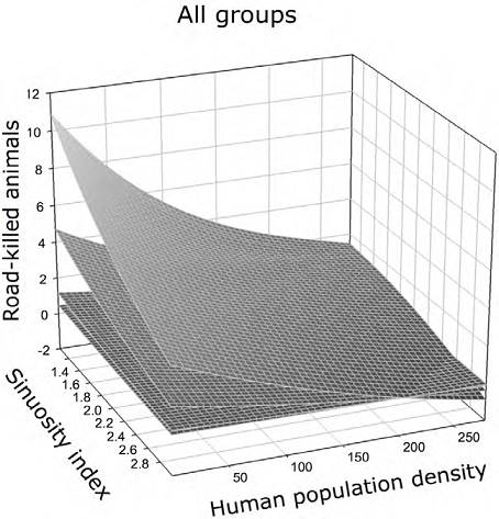 When we used the number of road kills (CART analysis) as response variable, we found important differences among animal groups (Fig. 6, Tables 2, 3). First, we identified a major division between mammals and the remaining 3 groups (reptiles, birds and amphibians) in terms of the magnitude of road kills (r2 = 22%). A secondary division occurred between reptiles and amphibians and birds. The main factor underlying these divisions of the tree was variation in road sinuosity. Therefore, those 10-km sections of the road with a sinuosity index > 1.15 had a lower abundance of killed animals, whereas road sections with sinuosity index < 1.15 had a greater abundance of killed animals. The CART analysis also indicated that human population density played a role in the division of road sections: those with a lower density (< 11.3 inhabitants/km2) showed a higher abundance of killed individuals (Fig. 6). While in contrast, road sections with a higher density (> 11.3 inhabitants/km2) had a lower number of killed individuals. The GLM supported the CART findings and indicated differences among groups of vertebrates. This analysis also indicated that population density and the sinuosity index were significant, but not their interaction (Fig. 7, Table 3). We found a negative relationship of the abundance with sinuosity and with population density. Specifically, the model predicted that those 10-km sections with higher sinuosity and low population density resulted in low abundances of killed animals. The higher abundances were predicted at low sinuosity (straight road sections) and low human population density (Fig. 7, Table 3).