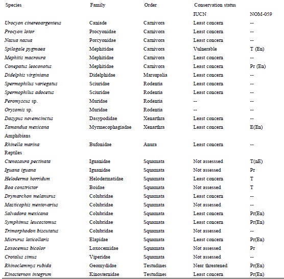 It has been shown that landscape features of roads have a clear influence on the species composition of animal kills (Bencke & Bencke, 1999). For example, proximity to wetlands seems to increase frequency of road impact on amphibians (Attademo et al., 2011; Smith & Dood, 2003). On the other hand, the proximity of roads to suburban and urban areas seems to increase mortality of mammals such as marsupials and bats (Bencke & Bencke 1999). In this study, road kills of opossums and the pygmy spotted skunks were especially frequent near suburban areas, were the landscape was modified by human activities such as agriculture and cattle ranching which seem to offer some resources for these species. All the species of reptiles and birds were vulnerable to vehicle collisions where coverage of dry forest was relatively high. Dry forest areas constitute important habitat for the species in these groups.