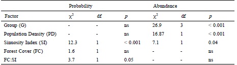 We complemented the previous analyses by characterizing the same landscape variables at this time for each individual road kill record. We used ArcMap tools (ESRI, 2011) to mark all the road locations in which at least 1 road kill was recorded, within the rest of the road length we generated a number of random points equivalent to the number of road kills recorded for each group. To analyze the resulting data, we applied GLM´s, this approach is more appropriate when variance in the response variable is not constant and when errors are not normally distributed (Crawley, 2012), as was the case of our response variables (probability of an animal being killed and the number of killed animals per 10 km-section). We tested the effects of 5 fixed factors and their interactions: 1 categorical (groups of vertebrates “G” with 4 levels: amphibians, birds, mammals and reptiles) and 4 continuous variables (sinuosity index ”SI”, forest cover “FC”, distance to rivers “DR” and population density “PD”). The analyses were conducted using generalized linear models with binomial error distribution for probability and Poisson for the abundances (Crawley, 2012). Saturated models were first fit and included all possible interactions. Models were then simplified based on sequential removal of non-significant fixed effects and detecting significant changes in residual deviance at each step. Predictions were obtained with the minimal model which includes only significant terms (Crawley, 2012; Faraway, 2005). All analyses were conducted in the statistical package R 3.02 (R Development Core Team, 2013).