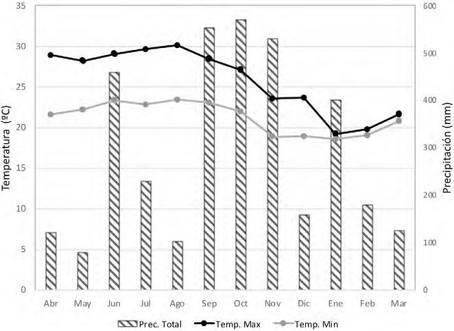 Resumen mensual de precipitación total (barras rayadas) y promedio de temperatura máxima (puntos negros) y mínima (puntos grises) por mes (de abril 2014 a marzo 2015). Datos de la Estación de Biología Tropical “Los Tuxtlas”, UNAM.