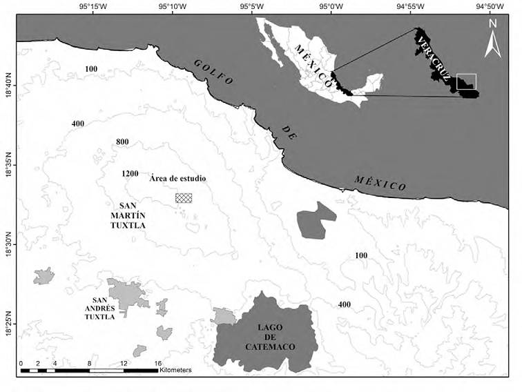 La sierra de Los Tuxtlas emerge sobre la llanura costera del golfo de México, ubicada al sureste del estado de Veracruz, México (Conabio, 2010). Esta región está constituida por 2 grandes macizos volcánicos: el volcán San Martín Tuxtla (1,680 m snm) y la sierra de Santa Marta (1,680 m snm) (Guevara et al., 2004). El estudio se llevó a cabo en el área de BMM conservado de la vertiente sureste del volcán San Martín Tuxtla, Municipio de San Andrés Tuxtla, que pertenece a la comunidad Adolfo Ruiz Cortines (Fig. 1). Esta zona tiene un clima templado, con una temperatura media anual de 18 ºC, así como una precipitación media anual de 4,000 mm y por lo menos 40 mm de precipitación durante el mes más seco (Guevara et al., 2004). Los árboles del dosel oscilan entre 20 y 30 m de altura, aunque en algunas ocasiones superan 40 m, e incluyen especies de los géneros Carpinus, Clethra, Engelhardtia, Liquidambar, Quercus y Ulmus. Éstos son hospederos con alta riqueza y abundancia de epífitas vasculares, destacando los helechos y orquídeas (Acebey et al., 2015; Krömer et al., 2013). Debido a que no existe una estación meteorológica cercana a la zona de estudio, se obtuvieron datos meteorológicos (precipitación y temperatura) de abril 2014 a marzo 2015 de la “Estación de Biología Tropical Los Tuxtlas” de la UNAM, ubicada a 140 m snm al pie del volcán San Martín Tuxtla (Apéndice 1).