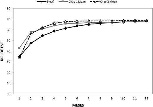 Se registraron, en total, 3,284 plantas de EVC en 0.08 ha (41,050 ± 1,906 plantas ha/año; Tabla 1), las cuales representaron a 66 especies pertenecientes a 34 géneros y 11 familias. Las curvas de acumulación de especies observadas y estimadas indican que el esfuerzo de muestreo fue suficiente para alcanzar casi la totalidad de especies estimadas para el sitio. De acuerdo al estimador chao 1 se alcanzó el 97.1% de las 68 especies esperadas, mientras que de acuerdo con el estimador chao 2, se alcanzó 95.9% de las 68.8 especies esperadas (Fig. 3).