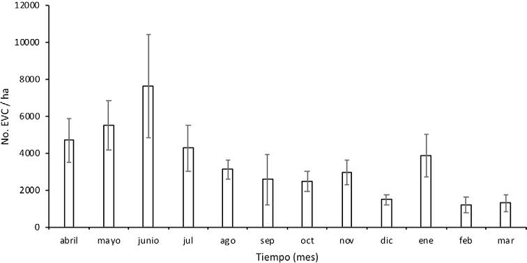 En la Figura 4 se muestra la dinámica de la caída mensual de las epífitas vasculares a lo largo de un año, donde la abundancia de EVC difirió significativamente entre los meses del año de muestreo (gl = 11; F = 3.66; p = 0.01); junio presentó una mayor abundancia de EVC (7,638 ± 2,779 plantas/ha; promedio ± 1 error estándar) en comparación con el resto de los meses y el mes con menor abundancia fue febrero (1,187 ± 429 plantas/ha). A pesar de que junio fue el mes con la mayor abundancia de EVC no fue el que presentó mayor riqueza de especies (Fig. 4).