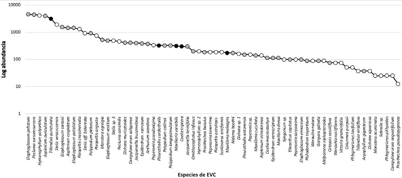 Entre las angiospermas las especies más abundantes son Tillandsia punctulata (Bromeliaceae), Stelis veracrucensis, S. aff. bidentata (Orchidaceae) y Monstera lechleriana (Araceae) (Fig. 5, Tabla 1). Las pteridofitas que presentaron mayor abundancia son Elaphoglossum peltatum (Dryopteridaceae), Pecluma sursumcurrens (Polypodiaceae), Hymenophyllum polyanthos (Hymenophyllaceae) y Asplenium auriculatum (Aspleniaceae). Tomando en cuenta solamente las EVC viables (Tabla 1), para el caso de las angiospermas, Orchidaceae tuvo la mayor abundancia con 5,562 ± 244 plantas viables ha/año, de las cuales S. veracrucensis fue la más abundante con el 19.2% del total de los registros. Para Bromeliaceae, la especie que presentó mayor cantidad de plantas viables fue T. punctulata con el 61.5% del total del registro de esta familia. En Araceae la mayor abundancia de plantas viables fueron de Monstera egregia con el 25.2% del total de registros para esta familia. En el caso de Piperaceae las plantas de Peperomia pseudoalpina presentaron mayor porcentaje de plantas viables con el 25.8%.