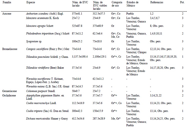 Las otras especies con alto potencial de aprovechamiento mencionadas anteriormente son orquídeas, para las cuales se registraron entre 150-262 plantas viables ha/año. Todas tienen un uso ornamental observado o reportado para la región de Los Tuxtlas y Veracruz (Carmona, 1996; Flores-Palacios y Valencia-Díaz, 2007), así como para México en general (Espejo-Serna, López-Ferrari et al., 2005; Red de Ornamentales, 2006). Además, estas 4 orquídeas se ofertan por un precio entre 12-24 USD por planta en el internet.