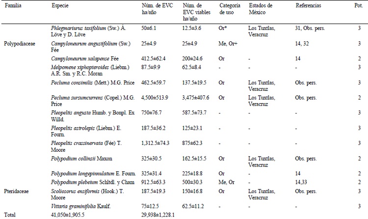 Las pteridofitas no incluyen ninguna especie con alto potencial, pero hay varias dentro de los géneros Asplenium, Elaphoglossum y Polypodium con follaje vistoso y forma de crecimiento atractiva en roseta o colgante, que tienen un potencial medio, entre ellas A. auriculatum, A. cuspidatum, E. erinaceum y P. longepinnulatum que fueron incluidas en la lista de las plantas ornamentales de México (Red de Ornamentales, 2006). Entre las 5 EVC de Elaphoglossum, resalta E. vestitum, con largas frondas cubiertas por escamas naranjas, para la cual se registró un valor de 212 plantas viables ha/año, a diferencia de otras menos atractivas (p. ej., E. petiolatum, E. sartorii) que alcanzaron valores de más de 1,000 plantas viables ha/año. Se ha reportado que especies del género Elaphoglossum son utilizadas en Estados Unidos de América como complemento de arreglos florales (Muñiz-Díaz de León et al., 2007), mientras que diferentes especies de Asplenium tienen usos ornamental y medicinal en México, Cuba y otras partes del mundo (Muñiz-Díaz de León et al., 2007; Núñez-Barrizonte et al., 2011; Rendón y Fernández-Nava, 2007). Por otro lado, se reporta a Phlegmariurus taxifolius con uso ceremonial y ornamental, la cual fue registrada con muy baja abundancia. Esta especie está en venta dentro del comercio ilegal en los mercados del centro de Veracruz (Flores-Palacios y Valencia-Díaz, 2007) y fue clasificada como vulnerable, según criterios de la Unión Internacional para la Conservación de la Naturaleza (UICN) a nivel regional (Armenta-Montero et al., 2015).