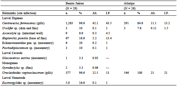 The fish studied herein belong to the same species, but we observed a difference in parasite richness between localities. Only 3 of the 10 species were shared between component communities: U. vaginoclaustrum, C. formosanus, and Uvulifer sp., resulting in a Jaccard value of 0.3 and a Morisita-Horn value of 0.70. The Simpson index values were similar in both component communities (Benito Juárez = 0.42; Atlatipa = 0.45), despite the fact that the component community of Benito Juárez had the highest species richness and that fish from Atlatipa harbored only 3 species. The Berger-Parker dominance index (d) values were 0.72 in Benito Juárez, dominanted by C. formosanus, and 0.65 in Atlatipa, dominanted by U. vaginoclaustrum.