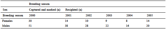 Eighty one adult nesting frigatebirds (30 female and 51 male) without broken external tail feathers were marked and released during the breeding season of 2000, then resighted the following 5 breeding seasons (2001-2005; Table 1). Nesting frigatebirds were caught randomly by hand at night. A random number series was selected from a random number table. We stood at the edge of the colony and started counting bushes to find the first random number. We followed the random sequence from there counting left and right as we moved through the colony. After catching frigatebirds, we temporarily removed them from the colony, and marked them using yellow canvas wing tags with black numbering placed on the left wing, 20.5 × 8 cm and 10.83 g (approximately 1% of the weight of the lightest individuals), and ringed with numbering metal rings placed on the left tarsus as described by Osorno (1996, 1999).