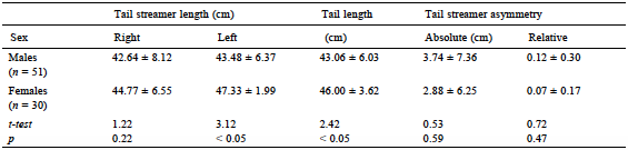 Average feather and tail lengths were longer in females than in males; in both sexes left feathers were longer than right feathers (Table 2). Nevertheless, differences between right and left feather lengths were significant in females (t29 = 2.08, p < 0.05) but not in males (t50 = 0.73, p = 0.47). Absolute and relative tail asymmetries were greater in males than in females (Table 2). The Spearman rank correlation analysis showed a significant negative correlation between tail streamer asymmetry and tail length (r81 = -0.558, p < 0.05; Fig. 2).