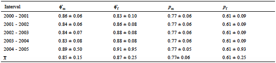 Model averaging results showed variation of estimated apparent survival (ϕˆ) among years (2000-2005), as well as a constant estimated resighting rate of male and female frigatebirds (pm = 0.77 ± 0.15, pf = 0.61 ± 0.25, Table 4).