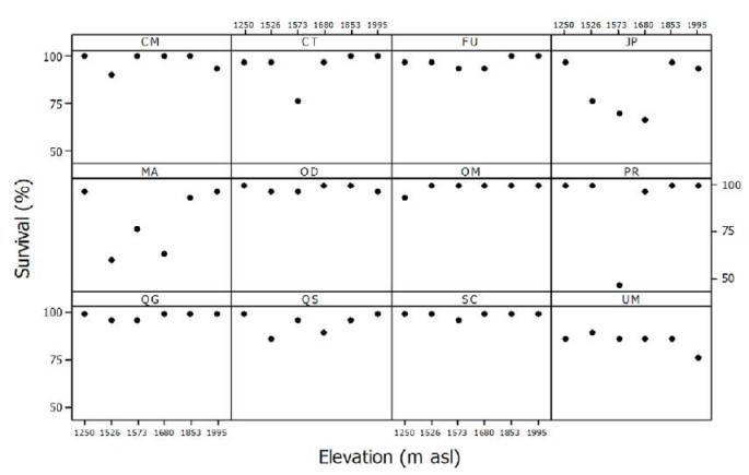 The reported tree species elevation ranges are based on their presence, not on frequency of occurrence (Table 2). The latter parameter would be more precise for determining the suitable range of habitats provided for each species in different elevation zones, but this information was unavailable for most species. Considering this, and in order to gain more information for the management of native tree diversity, we used several tree species distributed along the elevation gradient.