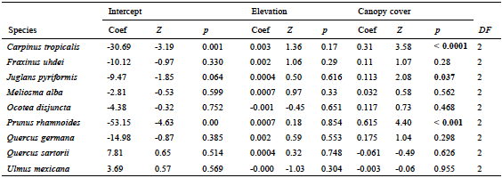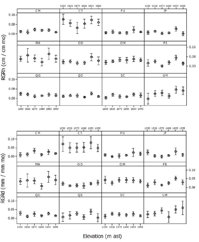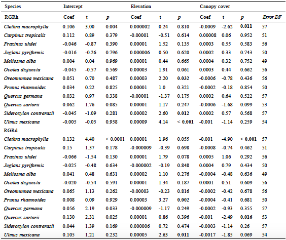 Mean relative growth rates were positive in all species. The highest values were recorded for C. tropicalis (RGRh = 0.095 ± 0.006 cm cm-1 mo-1, RGRd = 0.059 ± 0.005 mm mm-1 mo-1), followed by M. alba (RGRh = 0.069 ± 0.007 cm cm-1 mo-1, RGRd = 0.037 ± 0.004 mm mm-1 mo-1), while the lowest rates were for Fraxinus uhdei (RGRh = 0.013 ± 0.002 cm cm-1 mo-1, RGRd = 0.008 ± 0.002 mm mm-1 mo-1) and J. pyriformis (RGRh = 0.013 ± 0.002 cm cm-1 mo-1, RGRd = 0.011 ± 0.002 mm mm-1 mo-1) (Fig. 2). The effect of elevation on growth rates was only significant for 4 species (Table 4): in Oreomunnea mexicana, S. contrerasii and Ulmus mexicana, RGRh increased with elevation and in P. rhamnoides and U. mexicana, RGRd also increased with increasing elevation (p < 0.05). Canopy cover above the individual plant had a significant effect only on 2 species: Clethra macrophylla and Quercus sartorii displayed lower growth rates under increased canopy cover (Table 4).