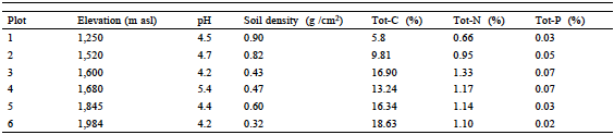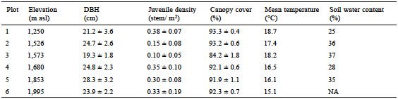 A summary of forest plot mean DBH, canopy cover, natural regeneration density and microclimate are shown in table 1. Tree mean DBH and density of natural regeneration were similar among all plots (p = 0.24 and p = 0.99, respectively). Canopy cover and tree regeneration density were not correlated with elevation (r = -0.049, r = -0.561 and r = 0.057, respectively, p > 0.05). As expected, mean temperature was highly correlated with elevation; temperature decreased as elevation increased (r = -0.955, p = 0.003; Table 1). Volumetric soil water content at 20-30 cm depth was relatively constant within each plot, ranging from 25 to 37% among plots (Table 1), and was not correlated with elevation (p > 0.05). Soil bulk density ranged from 0.32 to 0.90 g /cm2 and was not correlated with elevation (r = -0.809, p = 0.51). Soil tot-C increased with elevation (r = 0.90, p = 0.014), while soil tot-N, and tot-P were not correlated with elevation (r = -0.65, p = 0.16, and r = -0.15, p = 0.76 respectively).