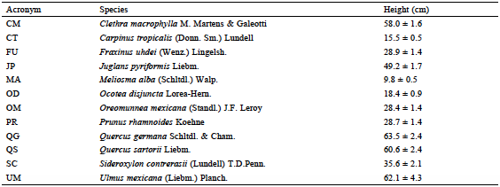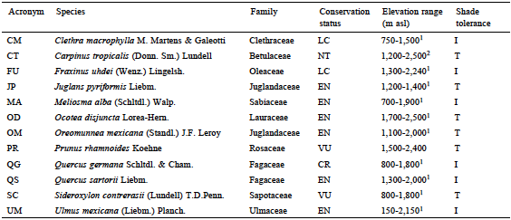 Twelve TMCF tree species were selected based on seed availability, conservation status and local value (Table 2). Nine of the studied species are included on the Red List of Mexican Cloud Forest Trees under some category of threat (González-Espinosa et al., 2011; see status in Table 2) and all are associated with advanced successional phases. Pioneer or light demanding, and shade tolerant species represent 2 contrasting strategies, but a continuous gradient of shade tolerance exists among tree species (Wright et al., 2003). Six species are reported as shade tolerant and 6 as intermediate tolerant; however, some shade tolerance classifications were proposed based on empirical observations in a specific area and contradictions have arisen among categories assigned to a given species (Toledo-Aceves et al., 2017). For example, Ulmus mexicana has been reported as a shade tolerant species but a preliminary study suggests an intermediate shade tolerance strategy (Toledo-Aceves et al., 2017). Four species are endemic to Mexico: Juglans pyriformis, Ocotea disjuncta, Quercus germana and Q. sartorii. Given their desirable wood properties, some of the studied species have been overharvested by local communities and some of their populations have disappeared locally in the study region; e.g., Juglans pyriformis, Ocotea disjuncta, Oreomunnea mexicana (Paré & Gerez, 2012), Meliosma alba and Sideroxylon contrerasii (T. Toledo-Aceves, pers. obs). Natural regeneration of some of these species is also absent or very low in the logged forest of the region (Ortíz-Colín et al., 2017).