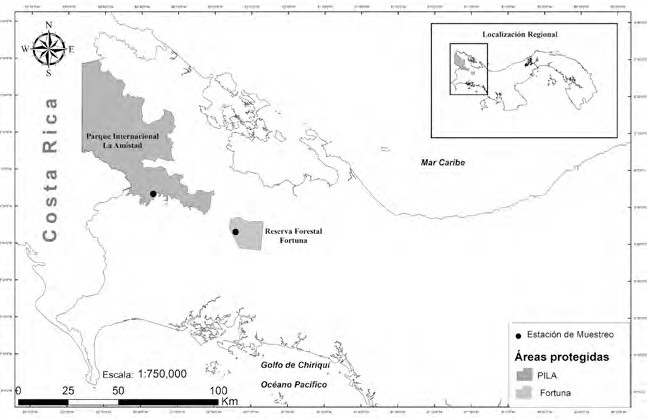 Dentro del Sistema Nacional de Áreas Protegidas (SINAP) de Panamá están incluidas unas 65 áreas, las cuales representan cerca de 34.5% del territorio nacional. En las provincias de Chiriquí y Bocas del Toro están ubicados el Parque Internacional La Amistad, Parque Nacional Volcán Barú, la Reserva Forestal Fortuna, el Humedal Lagunas de Volcán y el Bosque Protector Palo Seco, que en conjunto abarcan unas 365,000.5 ha (Araúz, 2007). La Reserva Forestal Fortuna (RFF) es considerada una de las áreas protegidas mejor conservadas del país y se distingue a nivel mundial por una extraordinaria diversidad biológica (Martínez et al., 2010; Vergara et al., 2008). La precipitación es de aproximadamente 4,000 mm/año y la temperatura promedio es de 16 °C (MiAmbiente, 2017). Esta reserva se localiza en la zona de vida bosque pluvial premontano, según el sistema de Holdrige (Martínez et al., 2010). El Parque Internacional La Amistad (PILA) también posee una excepcional biodiversidad y es considerada una de las zonas inalteradas de mayor importancia del continente Americano (Araúz, 2007; SOMASPA e INBio, 2005). La precipitación media anual oscila entre los 2,500 mm y los 5,500 mm, convirtiendo esta zona protegida en una de las regiones más húmedas del territorio nacional. Las temperaturas promedio anuales oscilan entre los 20 °C en las partes bajas y 10 °C en las partes altas (Herrera y Corrales, 2004). Según el sistema de clasificación de Holdrige, el área del PILA se localiza en la zona de vida de bosque perennifolio ombrófilo tropical, latifoliado altimontano (ANAM, 2011).