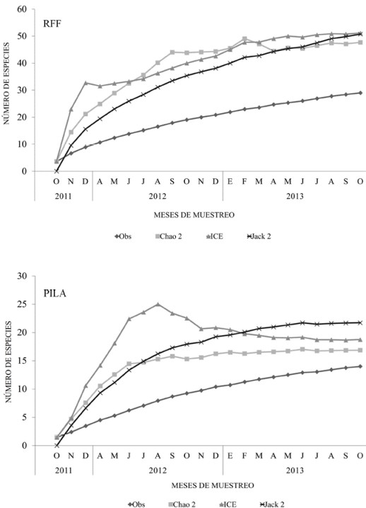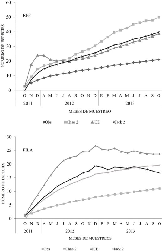 Para cada sitio y temporada del año se calculó el índice de diversidad de Shannon-Wiener (H´) y el índice de uniformidad (J) de Pielou utilizando el software PAST, versión 3.10 (Hammer et al., 2015). Para la representatividad del esfuerzo de muestreo en las áreas de estudio, se evaluó mediante una curva de acumulación de especies y cálculo de estimadores de riqueza no paramétricos (Chao 2, ICE y Jacknife 2), lo que permite un mejor análisis con menor sesgo, aleatorizado 200 veces usando el software EstimateS, versión 9.1.0 (Colwell, 2013). El análisis de correlación de Spearman se utilizó para evaluar si las variables ambientales (precipitación, temperatura y humedad relativa) son predictores significativos de la riqueza y abundancia de Sphingidae y Saturniidae durante todo el año en la RFF y PILA usando el software SPSS Statistics, versión 19 (Corp, I. B. M., 2010). Los valores de p < 0.05 se consideraron estadísticamente significativos. La información ambiental se obtuvo a partir de promedios mensuales de octubre de 2012 a octubre de 2013 de las estaciones meteorológicas más cercanas a los sitios de estudio.