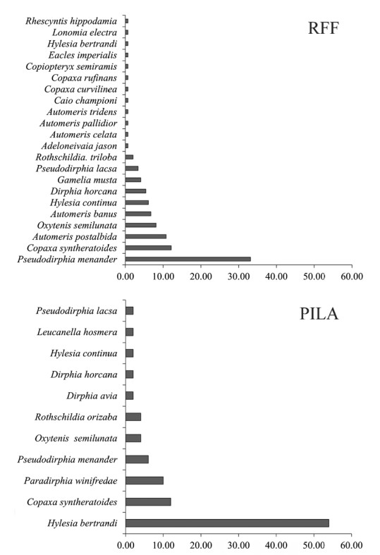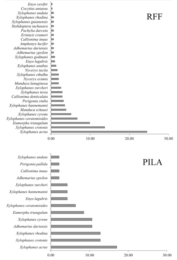 Los datos de índices de diversidad (H’) y equitabilidad (J) fueron altos para Sphingidae en ambos sitios de muestreo, en contraste con los resultados para Saturniidae que fueron bajos en ambos sitios (tabla 3). La mayoría de las especies estuvo representada por pocos individuos recolectados para ambas familias. De las 42 especies de Sphingidae recolectados, 5 especies (Xylophanes acrus, X. crotonis, Eumorpha triangulum, X. ceratomioides y X. cyrene) representaron 59.87% del total de individuos muestreados en la RFF y 7 especies (X. acrus, X. crotonis, X. rhodina, Adhemarius dariensis, X. cyrene, E. triangulum y X. ceratomioides) representaron 78.72% del total de individuos para el PILA (fig. 4). Para Saturniidae, de las 26 especies encontradas en ambos sitios, 7 especies (Pseudodirphia menander, Copaxa syntheratoides, Automeris postalbida, Oxytenis semioculata, A. banus, Hylesia continua y Dirphia horcana) representaron 82.43% del total de individuos recolectados. Para el PILA, 4 especies (Hylesia bertrandi, C. syntheratoides, Paradirphia winifredae y P. menander) contribuyeron a 82% del total de individuos muestreados (fig. 5).