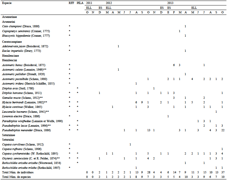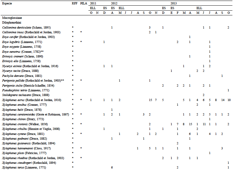 Durante el estudio para ambos sitios de muestreo las subfamilias con mayor riqueza de especies de Sphingidae fue Macroglossinae representada por 36 especies, seguido por Sphinginae con 5 especies y Smerinthinae con 1 especie (tabla 1). Para Saturniidae las subfamilias con mayor riqueza de especies fue Hemileucinae con 15 especies, seguido de Saturninae con 6 especies y Arsenurinae con 5 especies (tabla 2).