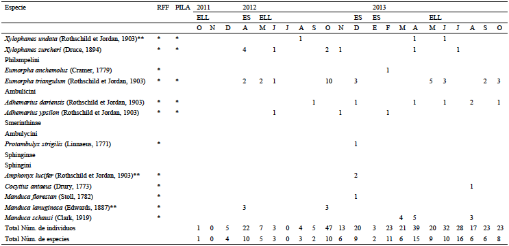 La metodología utilizada en este estudio dio como resultado una lista de especies que puede representar una línea base de la diversidad en las áreas de la RFF y el PILA. Los reportes que se han realizado en el país no describen una metodología como tal, en este estudio se realizó un inventario continúo durante más tiempo y con un método establecido y empleado consistentemente. Los valores de los estimadores no paramétricos de riqueza mostraron una mayor eficiencia de recolecta de especies en la familia Sphingidae en el PILA en comparación con las recolectas en la RFF. En contraste, las curvas de acumulación mostraron una mayor deficiencia de recolecta de especies de la familia Saturniidae en la RFF y en el PILA. Esta diferencia en la diversidad y abundancia de especies en ambas familias puede deberse al esfuerzo de muestreo en horas y factores de historia de vida de los grupos. Se ha documentado una mayor abundancia de individuos y riqueza de especies de esfíngidos entre las 19:00 y las 20:00 h, con una disminución entre las 23:00 y las 24:00 h (Karger et al., 2013; Lamarre et al., 2015). Por otro lado, el esfuerzo de muestreo para satúrnidos en este estudio fue durante las primeras horas de la noche (18:00 a 20:00 h), lo que pudo haber afectado la completa recolecta de especímenes debido a que, en este grupo, las especies están presentes durante toda la noche, con un aumento de los individuos a media noche (Lamarre et al., 2015). También, los patrones de historia de vida de estas 2 familias difieren debido a que las especies de adultos de satúrnidos son voladores activos solo para el apareamiento y la oviposición, mientras que los esfíngidos son activos para el apareamiento, la oviposición y la búsqueda de recursos alimenticios (Kitching y Cadiou, 2000).