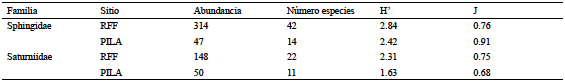 El índice de diversidad Shannon-Wiener observado para la familia Sphingidae fue mayor en contraste con la familia Saturniidae, esto debido a diferencias en el procedimiento experimental, el tipo de vegetación y el esfuerzo de muestreo como se mencionó anteriormente. Por otro lado, los valores de equitabilidad mejor representados (por encima de 0.8) sugieren una comunidad de Sphingidae equitativamente distribuida para el PILA, a diferencia de los otros resultados en los que se obtuvo una mayor desigualdad en el número de individuos por especie en los sitios de la RFF y el PILA, como por ejemplo X. acrus, X. crotonis (Sphingidae), H. bertrandi y P. menander.