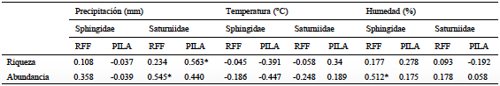 Durante el período de muestreo, la abundancia de especímenes fue notablemente estacional, con mayores recolectas durante la temporada lluviosa de esfíngidos en la RFF (p = 0.006) y satúrnidos en el PILA (p = 0.036). En contraste, no se encontraron diferencias significativas en la riqueza de especies de esfíngidos y satúrnidos entre las temporadas del año para RFF y el PILA. Se encontró una correlación positiva con la precipitación para la riqueza (0.563) en el PILA y la abundancia (0.545) en la RFF de Saturniidae (tabla 4). Las variaciones en la humedad relativa solo se correlacionaron con la abundancia de Sphingidae (0.571) en la RFF, pero no hubo correlación con la riqueza de especies en este mismo sitio. La variable ambiental de temperatura no presentó correlación con la abundancia y riqueza de ambas familias ni entre sitios de estudio (tabla 4).