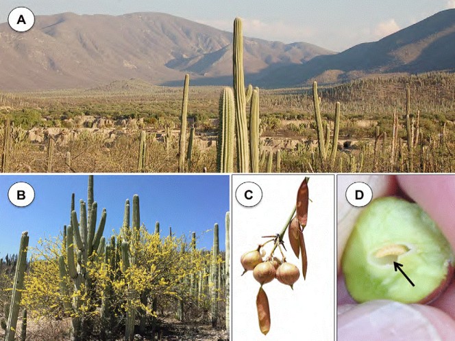 Parkinsonia praecox (Fabaceae-Caesalpinoideae) is known in the study area as “manteco” or “palo verde”, it is a 7 m tall tree (Fig. 1A). In Mexico, it is distributed in the Northwest (Baja California Sur, Sonora, Chihuahua, Sinaloa, Durango, Zacatecas and Nayarit), East Center (Jalisco, Colima, Michoacán, Guanajuato, Morelos, Guerrero, Puebla, México), East (Tamaulipas and Veracruz), and South (Oaxaca and Chiapas) (Villaseñor, 2016). It is a common species in some vegetal associations in the Zapotitlan Salinas Valley (López-Galindo et al., 2003; Montaña & Valiente-Banuet, 1998). P. praecox fruits are flattened brown pods 10 cm length and 1 cm width, arranged in racemes, generally in pairs (Fig. 1B). Seeds are shiny-brown color and 7 mm mean length (Pennington & Sarukhán, 2005). The flowering season occurs between December-May, and the fruiting period is between January-September (Arias et al., 2001; Pennington and Sarukhán, 2005). Infructescences of P. praecox showed an important incidence of galls (Fig. 1C). Galled fruits had 1 larval chamber located at the center surrounded by parenchymatous tissue (Fig. 1D) (Contreras-Varela pers. obs.). Asphondylia sp. (Diptera: Cecidomyiidae) is the galling insect. From November to March, the branches are leafless when flowering and fruit set occurs (Pavón & Briones, 2001), indicating that it is a totally deciduous species during this period.