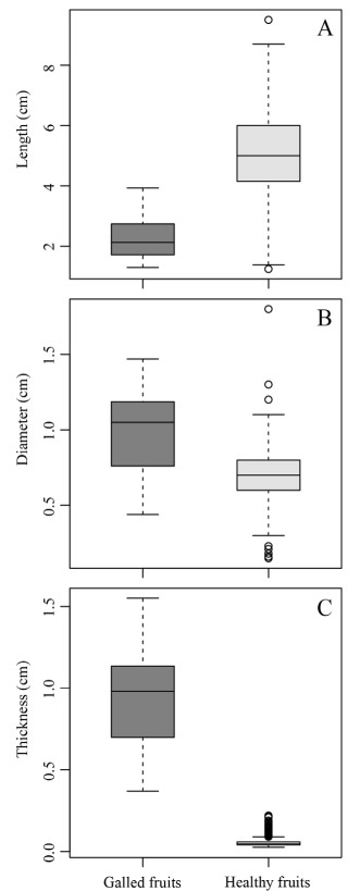 The number of fruits affected by galls was determined in 30 randomly selected branches with galls and fruits of 50 cm long (2 per tree) in 15 different trees. In 10 individuals of P. praecox it was determined macroscopical characteristics of galled and healthy fruits, 50 pairs of a galled and a healthy fruit were randomly selected. A digital caliper (CD-s6, Mitutoyo Corp., Kawasaki, Japan) was used to measure length, diameter (distance considered starting in the abscission line in the middle of the fruit) and thickness of galled and healthy fruits. Aditionally, in transversal sections of galled fruits we measured parenchymatous tissue, and larval chamber size. In healthy and galled fruits, we quantified the water and biomass content by recording the fresh weight (FW), and then these were oven-dried for 36 hours at 70 °C. Later, the dry weight (DW) was quantified using a weighing scale (CP-225D, Sartorius, Germany, 0.01 g of accuracy). The water content was calculated as (FW-DW)/FW. The biomass content was defined as DW/FW. The water and biomass contents are expressed as a percentage.