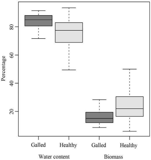 The morphological traits of galled and healthy fruits (length, diameter, thickness, water content, and biomass content) exhibited significant differences. The galled fruits were 2.91 ± 0.17 cm shorter than the healthy fruits (χ2 = 51.8, p < 0.001; Fig. 2A). On the other hand, galled fruits had 0.28 ± 0.04 cm larger diameter (χ2 = 23.2, p < 0.001; Fig. 2B) and were 0.87 ± 0.03 cm thicker (χ2 = 53.1, p < 0.001; Fig. 2C) than the healthy fruits. The water content was 4.24 ± 1.2% higher in the galled fruits (χ2 = 7.1, p < 0.01; Fig. 3), while healthy fruits had 4.2 ± 1.3% higher biomass content (χ2 = 7.16, p < 0.01; Fig. 3).