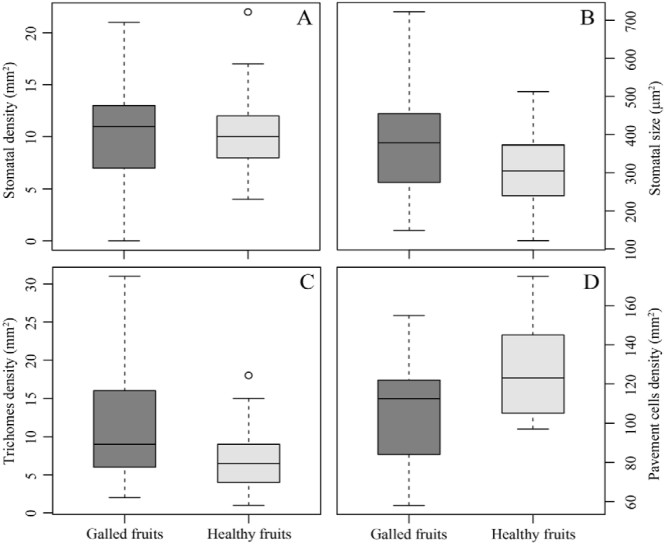 Generalized linear mixed models (GLMMs) were used to evaluate the relationship between galled and healthy fruits in each of the morphological traits (length, diameter, thickness, water content, biomass content) and anatomical features (trichomes, stomata, pavement cells). As fixed effects, we entered the galled and healthy fruits into the model. As random effect, we used intercepts for individuals of P. praecox, as well as random slopes for the effect of galled and healthy fruits.