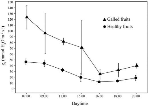 The gs was higher in galled fruits than in healthy fruits (χ2 = 12.6, p = 0.001). The interaction of daytime and the gall presence had a negative effect on the gs of galled fruits (χ2 = 36, p < 0.001). In the galled fruits, the highest values of gs were recorded at 07:00 h, while the lowest values were found in healthy fruits at 16:00 hrs. Likewise, the gs exhibited differences during the daytime (χ2 = 30, p < 0.001). Values of gs in galled and healthy fruits decreased throughout the day, with a slight increase in the last 2 records at night (18:00 to 20:00 h) (Fig. 5).