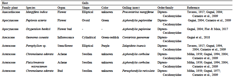 Buds, flowers, and fruits are poorly represented as host organs for galling insects, since these structures depend on the phenological stage of the plant (i.e., they may be unavailable to gallers throughout the year). The phenological dependence is more evident in tropical dry forests and xeric environments (Pezzini et al., 2014). Despite the low number of studies reporting galls on reproductive organs (Fernandes & Santos, 2014), the effects of galling on these organs could pose serious threats to the plants due to the potential impact they would have on plant performance and fitness (Fernandes, 1987). Galls on fruits exhibit noteworthy morphotypes, such as irregular (Santos et al., 2016), spherical (Quintero et al., 2014), amorphous, fusiform, globoid, ovoid, swollen or triangular (Isaias et al., 2014).