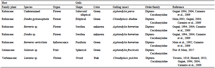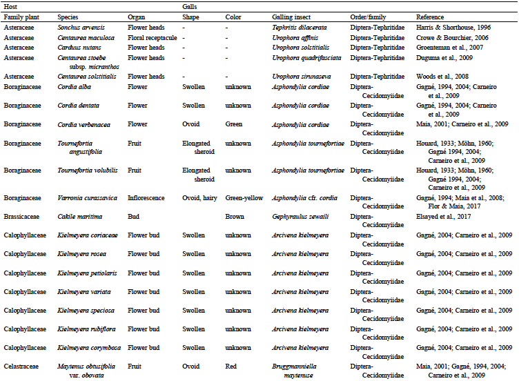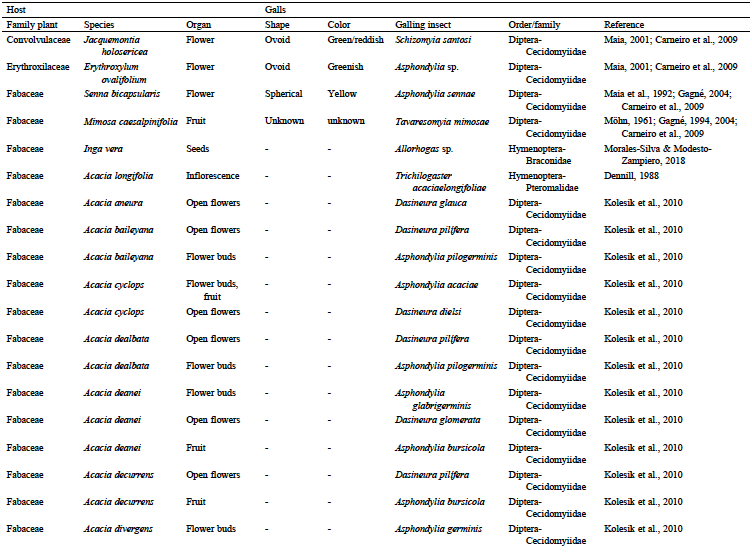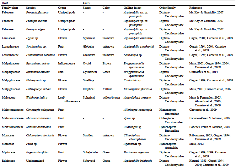 Some species in South America have been reported as hosts of fruit-gall inducing insects, such as Conostegia xalapensis (Melastomataceae) (Chavarría et al., 2009); and Miconia calvescens (Melastomataceae) (Badenes-Perez & Johnson, 2007). Curiously, most studies are developed in the Costa Rican tropical dry forest (Janzen, 1982); Australian seasonally tropical forest (Kolesik et al., 2010), and Brazilian savanna (Santos et al., 2016). There are few studies on xeric environments that report the presence of galls on fruits, i.e. in Brazilian Restinga, Pithecellobium tortum have galls in seeds (de Macêdo & Monteiro, 1989). In our work we reported galls on P. praecox fruits and this is a pioneer study related to the study of galls in this area (Tehuacán-Cuicatlán, Mexico).