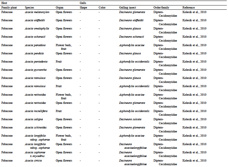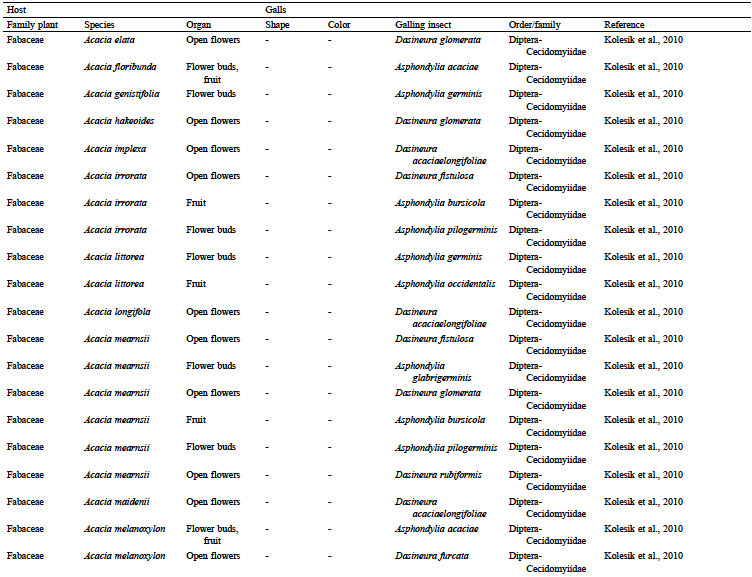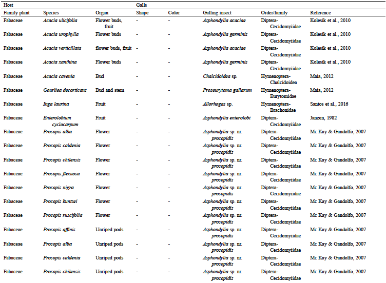In this study, we showed the incidence of galls in P. praceox fruits and its consequences on morphology and physiology. This is the first report of gall incidence on fruits in this semi-arid region of Central Mexico. In general, studies on galled fruits are scarce in the literature. We reviewed studies that report the presence of galls on reproductive structures, and we found 128 host plant species; Fabaceae was the most abundant host family (78 species), followed by Asteraceae (9 species), Boraginaceae (6) and Rubiaceae (6). The 2 most representative genera were Acacia (58 species) and Prosopis (14 species). Of the total number of host plant species found in our revision, 85.15% had galls on flowers (achene, buds, capitula, flowers, inflorescences) and the remaining 14.84% on fruits and seeds (Appendix).
