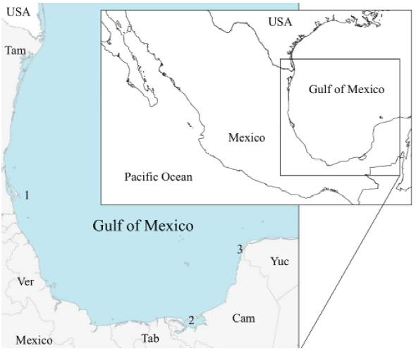 In this work, we describe reproductive characteristics of T. carolinense inhabiting sea-grass beds to test hypotheses about seasonality of reproduction, sex ratio and sexual system, and fecundity values in 3 Mexican collecting sites in the Gulf of Mexico (Fig. 1).