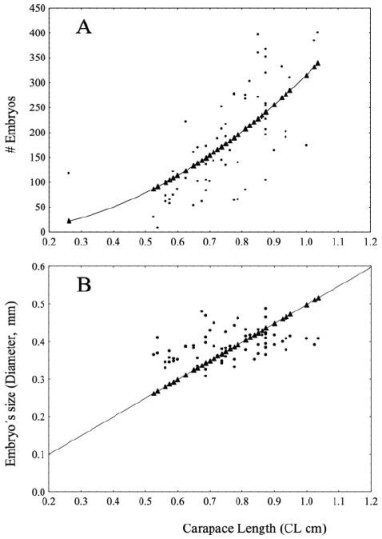 Fecundity analysis was performed with embryos in development stage 1. The mean number of embryos incubated by females was 159 with a diameter average of 0.39 mm: Celestún, 131 with 0.38 mm; El Cayo, 174 with 0.41 mm and Isla Lobos 170 with 0.34 mm. The relationship between #E and CL (adjusted to a quadratic model) was positive and significantly correlated, R2 = 0.89 (Fig. 4A) with an increment in #E = 314.97 * CL2. For each collecting site this relationship had similar values: Celestún, R2 = 0.87 (#E = 273.45 * CL2); El Cayo, R2 = 0.88 (#E = 393.95 * CL2) and Isla Lobos, R2 = 0.95 (#E = 263.64 * CL2). The relationship between ES vs. CL was positive in the entire sampled population R2 = 0.96 (ES = 0.0498 * CL) (Fig. 4B); Celestún had a R2 = 0.95 (ES = 0.0027 * CL); El Cayo, R2 = 0.98 (ES = 0.049 * CL) and Isla Lobos R2 = 0.99 (ES = 0.046 * CL).