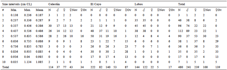 Four-hundred and eighty individuals were analyzed: 114 from Celestún, 222 from El Cayo, and 144 from Isla Lobos (Fig. 2D). Males and females from the 3 collecting sites, with sizes between 0.13 and 1.13 cm in CL are presented in Table 1. Males were found in the initial intervals while the females were in the last ones (Fig. 2). Regarding the NOv and Ov females, the latter were observed in the last class intervals, showing a trend being the largest size in the population (Fig. 3). In all collecting sites, this pattern was maintained for all groups (males, NOv and Ov females) (Figs. 2, 3).