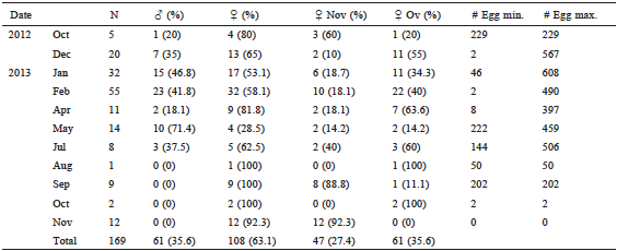 We observed ovigerous females with embryos in stages 1, 2 and 3; stage 4 was not recorded. Differences in #E between different development were obtained. In stages 1 and 2, was recorded a T = 4.48 and p-value = 0.00002, which means that the stages are different. A significant loss was observed since the means were #E = 206.23 and #E = 81.64, respectively. For stages 2 and 3, we obtained a T = 0.1 and p-value = 0.92, the means are equal, i.e., no significant differences in embryo loss between these stages. El Cayo, except for March and June, was the collecting site which noted a regular sampling effort during the 2013 annual cycle. During this period, we observed Ov females during all months with an abundance peak between December 2012 and February 2013 (Table 2).