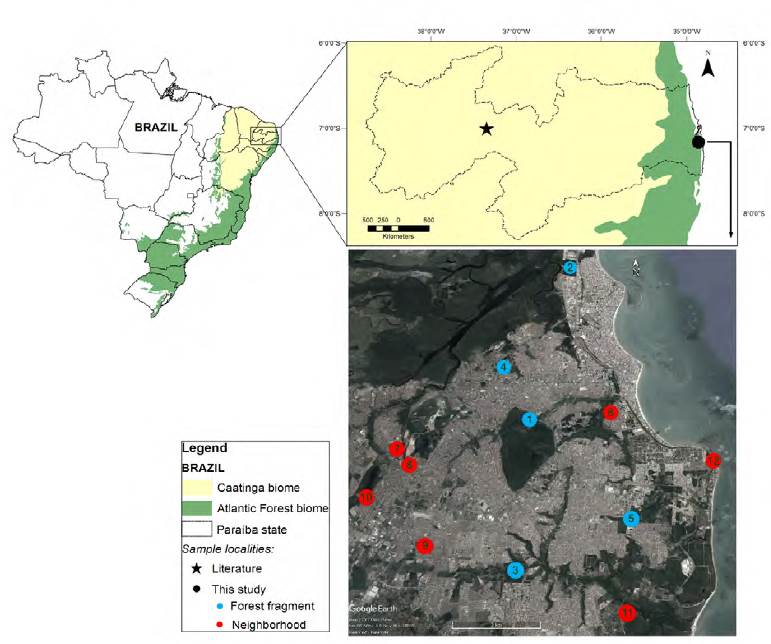 Field studies were conducted in 5 protected areas of Atlantic Forest and residential neighborhoods within the metropolitan region of João Pessoa, state of Paraíba (07°07’ S, 34°51’ W), northeastern Brazil. The sampled areas were: 1) Mata do Buraquinho Wildlife Refuge (517.8 ha), 2) Restinga de Cabedelo National Forest (136.36 ha), 3) Cuiá Natural Park (42 ha), 4) Arruda Câmara Zoobotanical Park (26.8 ha), 5) Cidade Verde Municipal Forest (22 ha) and the neighborhoods, 6) Altiplano, 7) Alto do Mateus, 8) Bairro dos Novaes, 9) Funcionários IV, 10) Jardim Veneza, 11) Paratibe, and 12) Penha (Fig. 1).