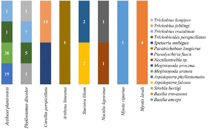We collected 197 bat ectoparasitic flies belonging to 15 species and 10 genera from the families Streblidae (13 species) and Nycteribiidae (2 species) (Table 1). Five genera and 12 fly species represent first records for the state of Paraíba, including Basilia anceps and Noctiliostrebla sp., as new records for northeastern Brazil. Most fly species (n = 13; ~87%) were species-specific, found on a single host species (Table 1, Fig. 2). Only Trichobioides perspicillatus and Trichobius costalimai were found on more than 1 host species (both on Artibeus planirostris and Phyllostomus discolor). The flies were collected on 102 bat specimens of 9 species and 7 genera in the families Phyllostomidae (6 species), Vespertilionidae (2 species), and Noctilionidae (1 species) (Table 1). Phyllostomus discolor was the bat most parasitized by flies (Strebla hertigi, Trichobioides perspicillatus, T. costalimai, and T. longipes; Fig. 2).