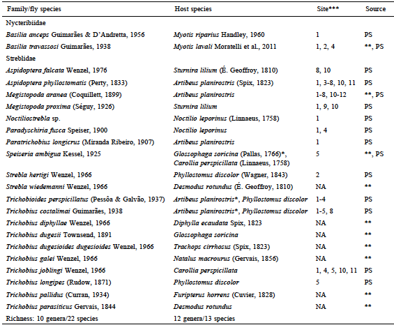 Recently, Barbier et al. (2016) recorded S. ambigua on Glossophaga soricina (Pallas, 1766) in the Caatinga of the state of Paraíba. This species is a primary parasite of C. perspicillata (Guerrero, 1994). Its record on other host species is classified as a transitory association or sampling contamination.