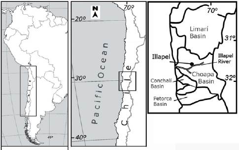 Eleven adult physid snails were sampled from the Illapel River (Fig. 1), Coquimbo Region, Northern Chile (31°37’55.30” S, 71°09’20.30” W) on March 2016 and preserved in ethanol. The snails were assigned to Physa acuta following Collado (2017). The worms were isolated by dissection of the mantle cavity of snails and observed using stereo and light microscopes (Motic). Photographs of the chaetae were obtained using a scanning electron microscope (SEM) Hitachi SU3500. The specimens were identified as C. limnaei according to taxonomic keys (Brinkhurst, 1971, 1986; Kathman & Brinkhurst, 1998) and additional literature regarding the morphology of the species (Cichy et al., 2016; Gelder, 1989; Gruffydd, 1965a, b; Khalil, 1961). Genomic DNA was extracted using the CTAB method (cetyltrimethyl ammonium bromide) (Winnepennickx et al., 1993) of one specimen assigned to this species. The mitochondrial 16S rRNA gene was amplified by polymerase chain reaction (PCR) using the primers 16Sar-L and 16Sbr-H (Palumbi, 1996). PCR profile was described by Collado and Méndez (2012). Nucleotide sequences were obtained by automatic sequencing in forward and reverse directions at Macrogen Company (South Korea). DNA sequences were edited in the software BioEdit (Hall, 1999) and aligned with Clustal X (Thompson et al., 1997). Phylogenetic analyses were performed using maximum parsimony (MP) and Bayesian inference (BI) methods. The MP analysis was based on heuristic search, the TBR algorithm and the random addition of sequences using the program PAUP* 4.0 (Swofford, 2003). The statistical confidence of the nodes was evaluated performing 100 bootstrap pseudoreplicates (Felsenstein, 1985). The BI analysis was performed in the software MrBayes v. 3.1.2 (Ronquist & Huelsenbeck, 2003), previously selecting the best model of sequence evolution with jModelTest (Posada, 2008). The analysis was run for 3 million generations sampling every 1,000 generations; posterior probabilities were obtained using a burn-in period of 10%. The analyses were performed together with 16S rRNA sequences from other congeners and naidid taxa (Bely & Sikes, 2010; Envall et al., 2006, 2012; Sjölin et al., 2005).