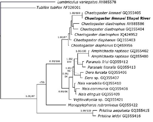 Amplification of the 16S gene in the specimen of C. limnaei from Illapel River produced a 503 base pair fragment. BLASTn analysis indicated 100% identity with a sequence of C. limnaei from Sacramento, USA (accession number: GQ355405) (Bely & Sikes, 2010). The MP analysis recovered a single tree (not shown) similar to the topology recovered by the BI analysis (Fig. 3). In both trees our sequence of C. limnaei formed a monophyletic group (1.00 posterior probability under BI; 100% bootstrap under MP) together with C. limnaei from Sacramento, USA, within a well-supported clade (1.00 posterior probability under BI; 87% bootstrap under MP) composed by other species of the genus Chaetogaster for which relationships are poorly supported.