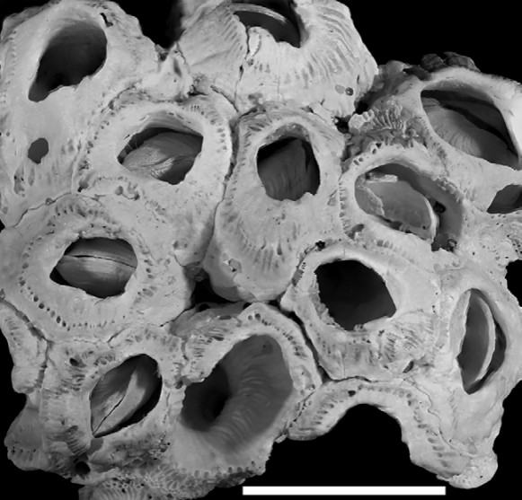 Distribution and habitat: only known from type locality; the shells were found inside shells of the shallow water cirripedian Balanus laevis (Fig. 2), and inside shells of Concholepas concholepas (Bruguière, 1789) and Trochita trochiformis (Born, 1778).