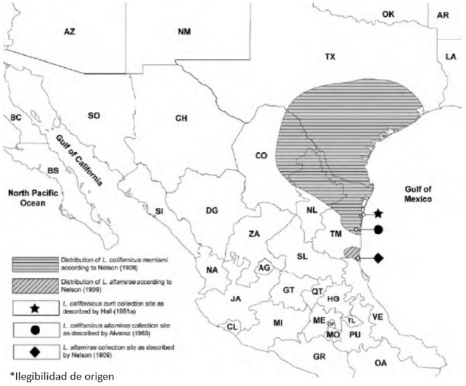 The type specimen for the series (not a member of the white-sided or black-tailed groups), which Nelson (1904) initially described as the Alta Mira jackrabbit (Lepus merriami altamirae), was said to be restricted to the coastal plain of southern Tamaulipas, extreme northern Veracruz and the eastern border of San Luis Potosí, Mexico. L. merriami had been described by Mearns in 1896 as a new species very similar to Lepus callotis of Mexico but with shorter ears with black tips instead of white (Mearns, 1896). Nelson (1904) noted that the Alta Mira jackrabbit had a limited distribution, occupied the southernmost area of the species range along the Gulf Coast of Mexico, and probably did not occur as far north as Victoria, Tamaulipas. Nelson (1909), later described the animal’s elevational range as between sea level and 150 m within the “Arid Tropical” zonal range.