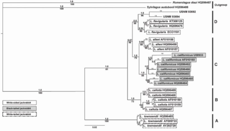 L. alleni and L. californicus clustered together in one clade with high support in both methods (posterior probability = 1.0; bootstrap = 79%), whereas L. flavigularis and the museum samples were separated from these 2 taxa into another group with moderate posterior probability (0.8), and relatively low bootstrap support (68%). Bayesian and ML phylogenetic analyses support a relationship between the museum samples (L. altamirae) and the group of white-sided jackrabbits, L. flavigularis.