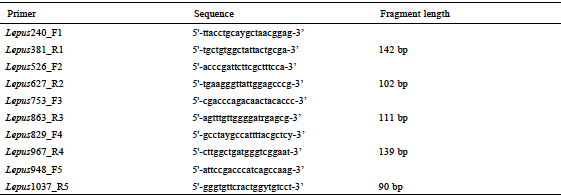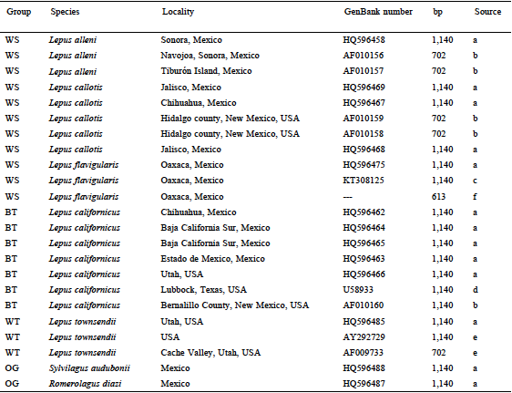 To examine interspecific relationships of L. altamirae specimens, we compared sequences from the 2 museum samples to MT-CYB sequences (613 to 1,140 bp) of 11 representatives of white-sided jackrabbits (L. callotis, L. flavigularis, and L. alleni), 7 black-tailed jackrabbits (L. californicus), and 3 white-tailed jackrabbits (Lepus townsendii) obtained from GenBank. We used sequences of the genera Sylvilagus and Romerolagus as outgroups. We downloaded these sequences from the publicly available GenBank database (http://www.ncbi.nlm.nih.gov; Table 2).