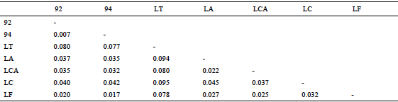 We used SEQUENCHER V.5.4.1. (Gene Codes Corp. Ann Arbor, Michigan) to edit and map the nucleotide fragments of the 2 museum samples to a reference sequence. We used the consensus sequence of 5 species of Lepus as the reference: L. alleni, L. californicus, L. callotis, L. flavigularis, and L. townsendii (GenBank accession numbers HQ596458, HQ596463, HQ596468, HQ596475, HQ596485 respectively). We then used the “Muscle algorithm” (Edgar, 2004) as implemented in “Sequencher” to align our reference-based assemblies against the entire data set of sequences downloaded from GenBank. The alignment of these 5 species of Lepus and the museum samples (USNM 93692 and USNM 93694) was used to calculate genetic distance using Kimura’s (1980) two-parameter model. The pairwise distance matrix was generated by the dist.dna function from the ape 3.4 R package (Paradis et al., 2004).